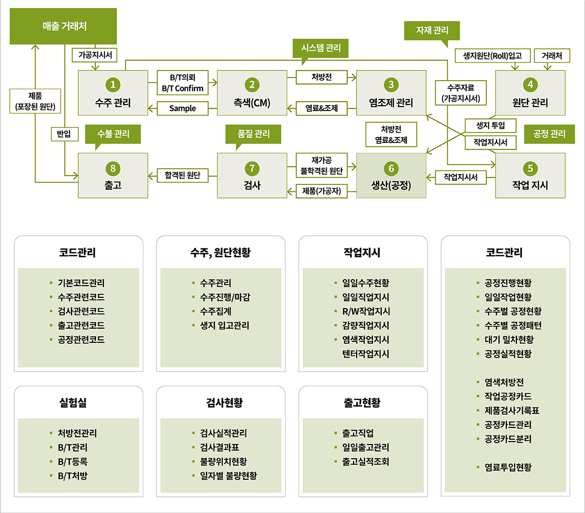생산계획 수립, 생산이행, 설비가동, 제품 출하 및 평가 활동을 지원하는 시스템입니다.