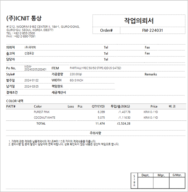외주 생산(제직,염가공), 매출 및 입금까지 기업의 모든 핵심 업무를 관리할 수 있습니다.