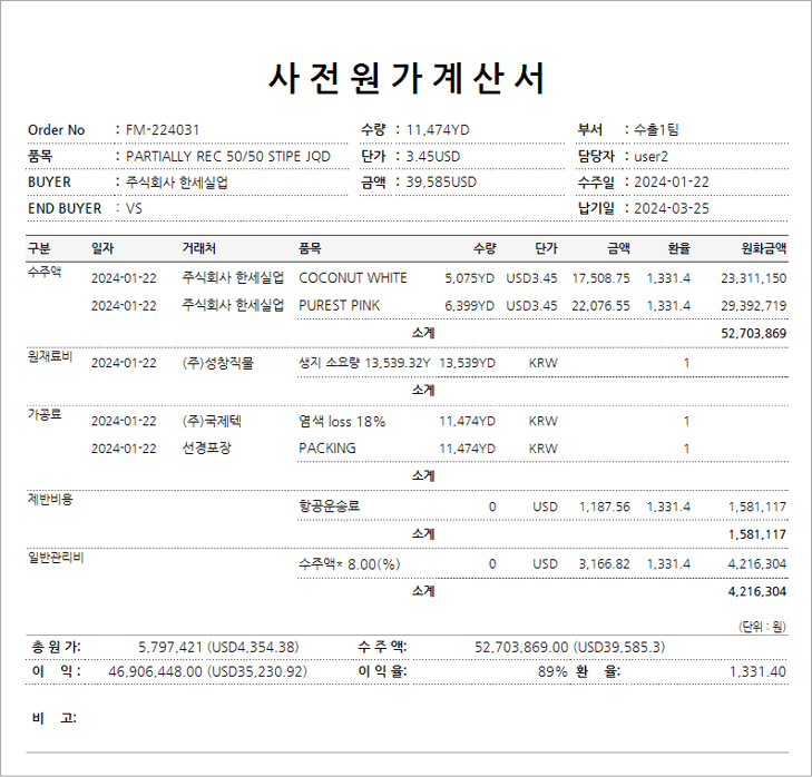 | 계약관리 | 바이어와의 수주 계약 오더 및 COLOR 내역, 사전원가의 산정, 가공 내역의 등록 및 오더 내역의 집계 관리 | 계약관리 | |