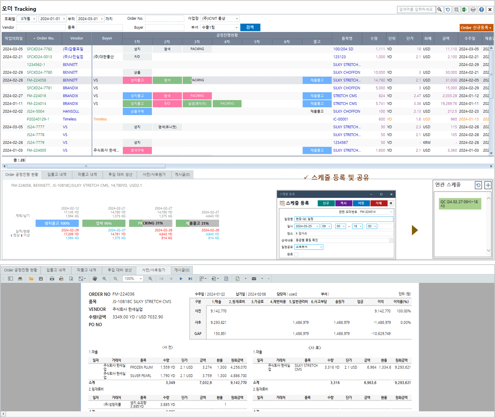 계약 및 Order 원가, 작업지시서 관리, 출고 의뢰 관리