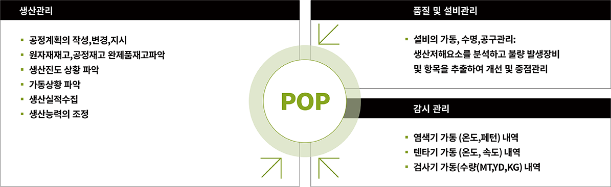 생산계획 수립, 생산이행, 설비가동, 제품 출하 및 평가 활동을 지원하는 시스템입니다.