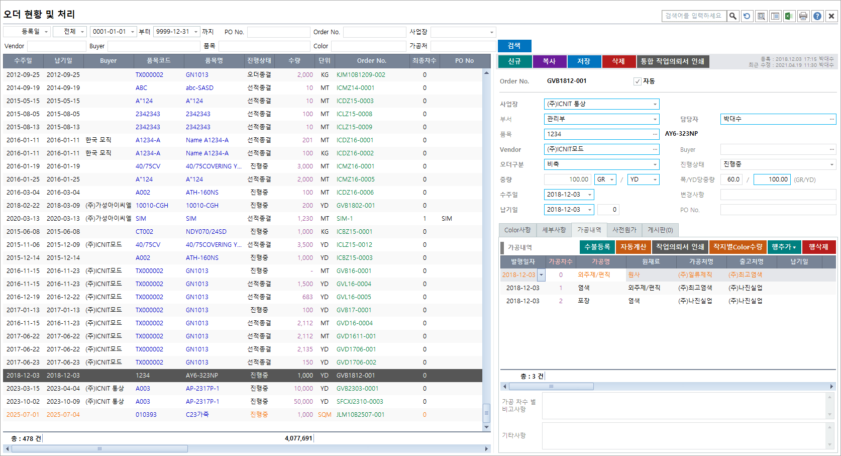 | 계약관리 | 바이어와의 수주 계약 오더 및 COLOR 내역, 사전원가의 산정, 가공 내역의 등록 및 오더 내역의 집계 관리 | 계약관리 | |